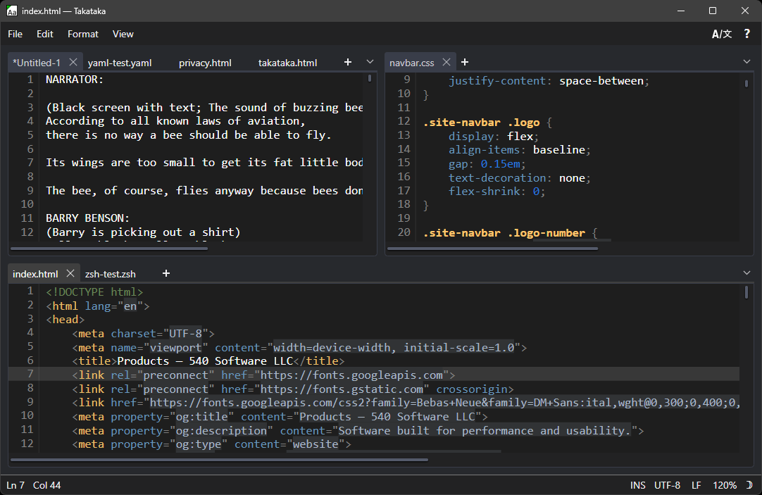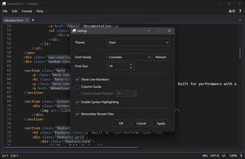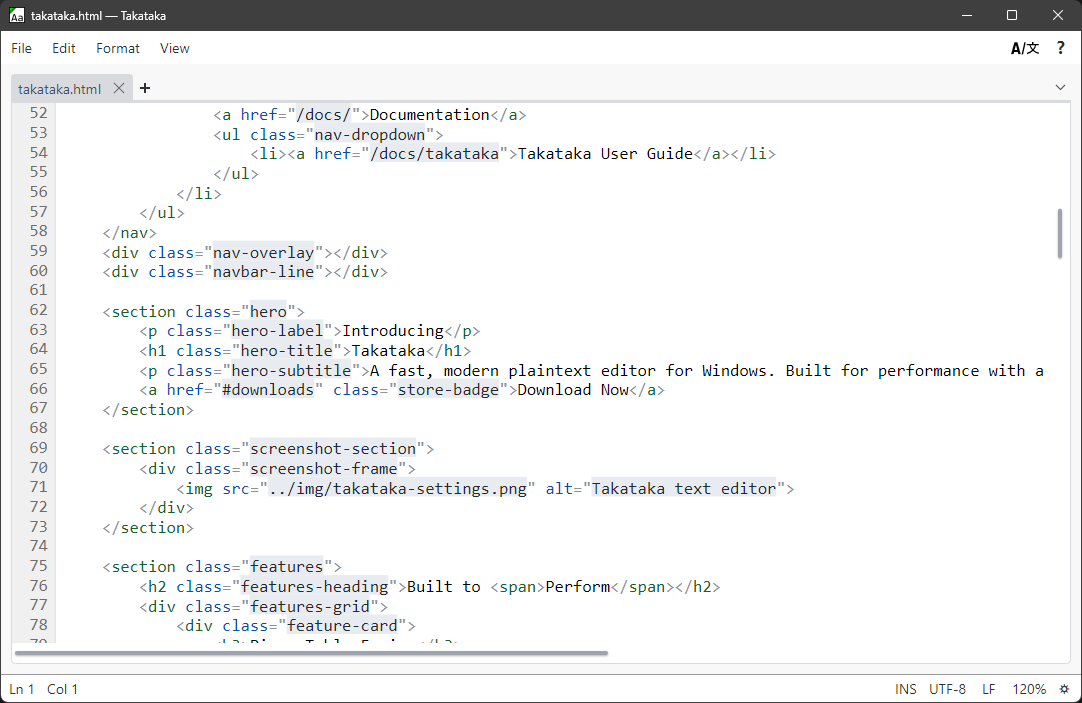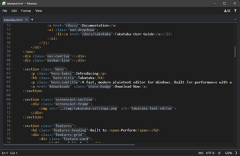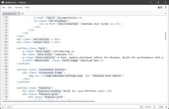 Takataka is a free and fast, lightweight text editor for Windows designed around everyday usability. Whatever you're doing, Takataka is designed to stay out of your way and let you do it. Set up whatever crazy split tab layout you want, break tabs out into their own new windows, or open a file with millions upon millions of lines with no slowdown.
